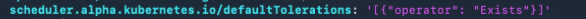 $ oc patch namespace dummy --type=merge -p '{"metadata": {"annotations": { "scheduler.alpha.kubernetes.io/defaultTolerations": "[{\\"operator\\": \\"Exists\\"}]"}}}'